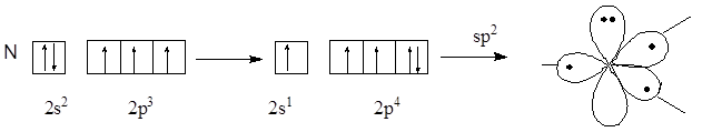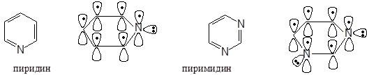В сопряжение пиррольный атом азота предоставляет р-орбиталь с неподеленной парой электронов, а пиридиновый атом азота – р-орбиталь с неспаренным электроном, так как неподеленная пара электронов пиридинового атома азота расположена на гибридной орбитали. Пиридин и пиримидин, являющиеся шестичленными гетероциклическими соединениями, также отвечают всем критериям ароматичности. В создании сопряженной системы в этих молекулах участвуют 6 электронов. Каждый атом, входящий в цикл, отдает в сопряжение по одному р-электрону. В этих соединениях, в отличие от пятичленных гетероциклов, имеет место только p,p-сопряжение, так как эти молекулы в своем составе содержат только пиридиновые атомы азота.