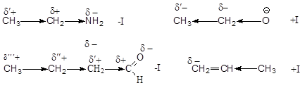 В пурине содержатся три пиридиновых атома азота (атомы под номерами 1,3,7) и один пиррольный (под номером 9), в создании сопряженной системы участвуют 10 электронов (4n+2=10, n=2). В молекуле имеет место как p,p-сопряжение, так и р,p-сопряжение. Делокализация электронов (выравнивание электронной плотности) в результате сопряжения приводит к образованию более устойчивых систем, характеризующихся отличающейся реакционной способностью от той, которая ожидалась, исходя из структурной формулы соединения. На реакционную способность молекул влияют также заместители, связанные с атомом углерода, которые за счет проявляемых ими электронных эффектов приводят к изменению полярности связей и их прочности. Различают два типа электронных эффектов заместителей: индуктивный и мезомерный. Индуктивный эффект (I) – это передача электронного влияния заместителя по системе s -связей. Он возникает, если связь образована атомами, разными по электроотрицательности. Индуктивный эффект передается на небольшие расстояния (3 – 4 s -связи) и затухает. Графически обозначается стрелкой вдоль s – связи и показывает смещение электронной плотности к более электроотрицательному атому. Отрицательный индуктивный эффект (- I) – смещение электронной плотности по системе s – связей к заместителю. Его проявляют более электроотрицательные, чем углерод, атомы и группы атомов. Положительный индуктивный эффект (+ I) – смещение электронной плотности по системе s – связей от заместителя. Его проявляют углеводородные радикалы и анионы, связанные с атомом углерода. Принято считать, что индуктивный эффект атома водорода равен нулю, т.е. связь С-Н является неполярной ковалентной связью.