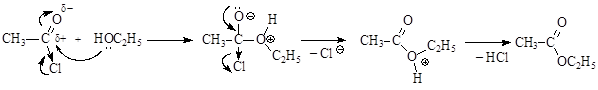 Величина положительного заряда, возникающего на атоме углерода оксогруппы, увеличивается с усилением электроноакцепторного характера заместителя (d+ возрастает с усилением отрицательного индуктивного эффекта по сравнению с положительным мезомерным эффектом). Отличием приведенных выше соединений от альдегидов и кетонов является то, что 2 электрона p-связи углерод-кислород участвуют в сопряжении с неподеленной парой р-электронов гетероатома (атомов галогена, серы, кислорода или азота), что приводит к повышению стабильности соединений. Нуклеофильное присоединение к карбонильной группе этих соединений приводило бы к изменению гибридизации атомных орбиталей углерода с sp2 на sр3 и разрушению системы сопряжения, уменьшению стабильности молекулы. Для сохранения сопряженной системы в реакциях с нуклеофилами после присоединения нуклеофильной частицы происходит отщепление уходящей группы и регенерация сопряжения. В итоге нуклеофильная частица оказывается связанной с ацильной группой – R-C=O, поэтому реакции производных карбоновых кислот называют реакциями ацилирования. Общая схема нуклеофильного замещения имеет вид: