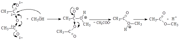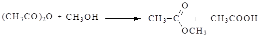 Ангидриды карбоновых кислот несколько менее реакционно способны в реакциях ацилирования вследствие меньшего положительного заряда на атомах углерода карбонильных групп. Меньший положительный заряд в сравнении с галогенангидридами возникает из-за того, что атом кислорода проявляет отрицательный индуктивный эффект по отношению к обеим карбонильным группам. При ацилировании спиртов ангидридами кислот, как и при ацилировании с помощью галогенангидридов, выделяющуюся кислоту связывают добавлением органических оснований.