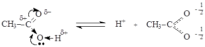 В отличие от альдегидов и кетонов, карбоновые кислоты имеют О-Н кислотный центр, за счет которого проявляют сравнительно сильные кислотные свойства. Сила карбоновых кислот зависит от величины эффективного положительного заряда на атоме углерода карбоксильной группы. Чем больше величина этого заряда, тем сильнее пара электронов атома кислорода гидроксильной группы вовлечена в р,p-сопряжение, тем сильнее поляризована связь и ослаблена связь О-Н, тем легче идет ее разрыв с образованием мезомерно стабилизированного карбоксилат-аниона: