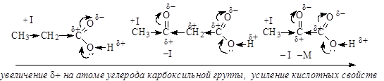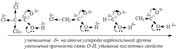 Именно из-за стабильности карбоксилат-анионов и легкости их образования карбоновые кислоты проявляют более сильные кислотные свойства, чем фенолы, тиолы и спирты. Величина эффективного заряда на атоме углерода карбоксильной группы и кислотные свойства зависят от характера радикала, связанного с карбоксильной группой: электроноакцепторные заместители усиливают кислотные свойства соединений, электронодонорные – ослабляют.