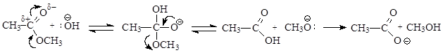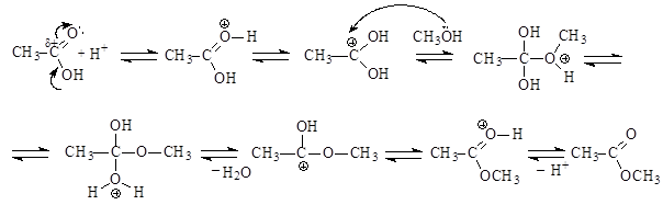 Присоединение протона к основному центру кислоты приводит к образованию карбкатиона - реакционноспособной электрофильной частицы, которая легко подвергается атаке нуклеофилом – молекулой спирта. Образовавшийся оксониевый катион, отщепляя воду, превращается в карбкатион, который регенерирует сопряженную систему путем отщепления протона, что приводит к образованию сложного эфира и возврату катализатора. Ионы водорода катализируют и прямую, и обратную реакции, равновесие реакции можно смещать, используя принцип Ле-Шателье. Гидролиз сложных эфиров, катализируемый основаниями, протекает необратимо.