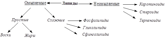 Лекция № 8Название липиды произошло от греческого слова lipos – жир. Под термином липиды объединяют большую и разнородную группу веществ – жиры и жироподобные вещества, являющиеся органическими соединениями растительного и животного происхождения, различающиеся по составу, но близкие по физико-химическим свойствам. Липиды не растворимы в воде, но хорошо растворяются в неполярных органических растворителях, таких как диэтиловый эфир, бензол, петролейный эфир и др. В живых организмах липиды выполняют следующие функции: - липиды являются структурными компонентами биологических мембран, обеспечивают их полупроницаемость; - липиды – форма, в которой организм запасает энергию; - липопротеиды – транспортная форма липидов, в которой транспортируется запасенная энергия; - липиды – растворители жирорастворимых витаминов; - липиды выполняют терморегуляторную функцию; - липиды образуют защитный слой на клеточных стенках бактерий, листьях высших растений, на коже позвоночных, выполняя т.о. защитную функцию. Классификация липидов представлена на схеме: