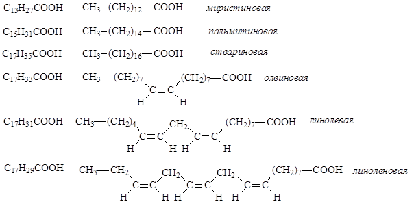 Химические и биологические свойства жира определяются входящими в его состав триацилглицеринами и в первую очередь длиной цепи, степенью ненасыщенности остатков жирных кислот и их расположением в триглицериде. В состав жиров входят в основном неразветвленные углеводородные радикалы жирных кислот, содержащие четное число атомов углерода (от 4 до 26), как насыщенные, так и моно- и полиненасыщенные. Наиболее часто в составе жиров встречаются миристиновая, пальмитиновая и стеариновая кислоты – представители насыщенных одноосновных карбоновых кислот, и олеиновая, линолевая, линоленовая – представители ненасыщенных одноосновных карбоновых кислот.