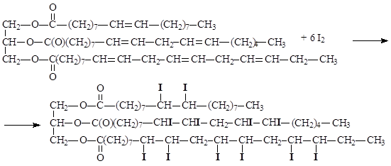 Степень ненасыщенности триацилглицеринов характеризуется йодным числом, которое показывает максимальную массу йода, которая может присоединиться к 100 г жира.