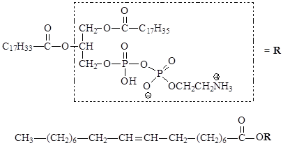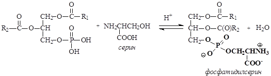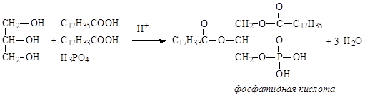 Фосфолипиды представляют собой, также как и жиры, сложные эфиры глицерина. В отличие от триацилглицеринов, третья спиртовая группа глицерина связана не с карбоновой кислотой, а с фосфорной. Другая особенность фосфолипидов состоит в том, что остаток фосфорной кислоты связан сложноэфирной связью с аминоспиртом. Фосфолипиды являются производными фосфатидной кислоты, которая образуется в результате этерификации двух ОН групп глицерина жирными карбоновыми кислотами, а третья ОН группа глицерина этерифицируется фосфорной кислотой.