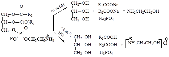Фосфолипиды являются бифильными веществами, так как содержат в своей структуре неполярные углеводородные радикалы карбоновых кислот (гидрофобная часть) и полярный ионизированный фрагмент, образованный аминоспиртом и фосфорной кислотой (гидрофильная часть), который в формулах выделен жирным шрифтом. Благодаря бифильности, фосфолипиды частично растворимы в воде и способны транспортироваться кровью из печени в органы и ткани, где формируют структуру клеточных мембран. Как сложные эфиры, фосфолипиды подвергаются гидролизу в кислой или щелочной средах:
