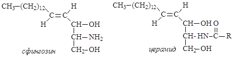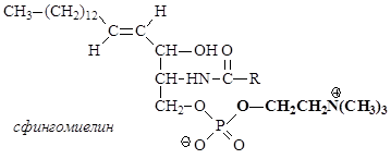 В нервных тканях обнаружены производные сфингозина – сфингомиелины. При гидролизе сфингомиелины образуют одну молекулу жирной кислоты, одну молекулу сфингозина, одну молекулу азотистого основания (чаще это холин) имолекулу фосфорной кислоты. Именно поэтому сфингомиелины относятся к классу фосфолипидов.