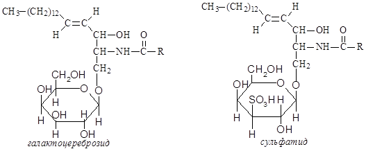 Сфингомиелины являются наиболее распространенными сфинголипидами. Они в основном находятся в мембранах животных и растительных клеток. Особенно богата ими нервная ткань; сфингомиелины обнаружены также в ткани почек, печени и других органов. Гликолипиды – многокомпонентные соединения, являющиеся производными сфингозина, не содержащими фосфорной кислоты и холина, но содержащие в своем составе углеводный фрагмент. Аминогруппа сфингозина ацилирована высшей жирной кислотой, а гидроксильная группа у первого атома углерода сфингозина связана с остатком углевода (моносахарида или олигосахарида).