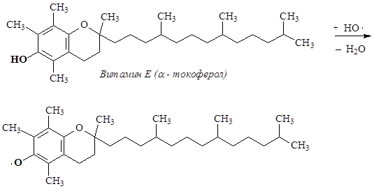 Глубина пероксидного окисления липидов зависит в первую очередь от состава липидов: с увеличением степени ненасыщенности жирных кислот, входящих в состав липидов, скорость окисления возрастает. Пероксидное окисление липидов приводит к повреждению клеточных мембран, структурными элементами которых являются липиды. Антиоксидантами по отношению к ненасыщеным липидам являются витамины группы Е – токоферолы, которые ингибируют процесс пероксидного окисления. Антиокислительная функция токоферолов определяется наличием подвижного атома Н и способностью реагировать с активными радикалами с образованием малоактивных радикалов, стабилизированных р,p-сопряжением.