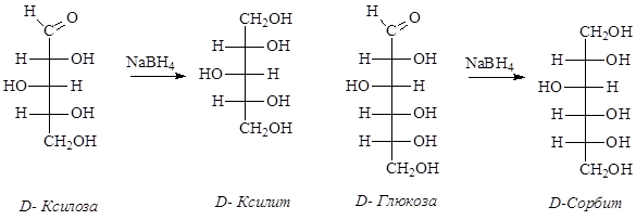 Этиленгликоль используется для изготовления антифризов, для получения полимеров, глицерин – для получения взрывчатых веществ, лекарственных препаратов, полимеров, как компонент смазок, кремов, парфюмерных и косметических препаратов, медицинских мазей, как мягчитель для тканей, кожи, бумаги. Ксилит, сорбит получают восстановлением моносахаридов: