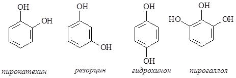 Многоатомные фенолы, подобно фенолу, являются слабыми ОН-кислотами, имеющими несколько констант диссоциации. Для них, как и для фенола, характерна реакция с FeCl3, приводящая к образованию окрашенных продуктов: пирокатехин дает зеленую окраску, резорцин – темно-фиолетовую, гидрохинон – черно-фиолетовую. Как и фенол, многоатомные фенолы легко вступают в реакции электрофильного замещения – подвергаются галогенированию, нитрованию, ацилированию. На воздухе легко окисляются, особенно легко происходит окисление пирокатехина и гидрохинона с образованием, соответственно, 1,2-бензохинона и 1,4-бензохинона.