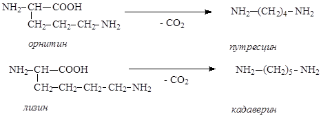 Диамины – органические соединения, содержащие в молекуле две аминогруппы. В природе чаще всего встречаются пента- и тетраметилендиамины Н2N(CH2)nNH2, где n = 5 и 4, содержащиеся в продуктах гнилостного распада белков – соответственно, кадаверин и путресцин. Эти диамины образуются при ферментативном декарбоксилировании,соответственно, лизина и орнитина: