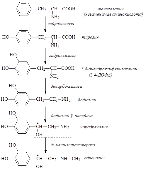 Димедрол используется в качестве противоаллергического препарата, обладает слабым снотворным действием. Эфедрин используется как сосудорасширяющее средство. Большое значение имеют также другие представители гетерофункциональных соединений – аминофенолы, содержащие в своей структуре остаток двухатомного фенола – пирокатехина (катехола или 1,2-диоксибензола). Группу биогенных аминов, являющихся производными пирокатехина (катехола) и осуществляющих регуляцию функций эндокринных желез и передачу нервных импульсов, называют катехоламинами. Катехоламины рассматривают как гормоны и нейромедиаторы. К биогенным катехоламинам относятся дофамин, L-норадреналин и L-адреналин. Основная функция дофамина – медиатор центральной нервной системы. Нарушение синтеза дофамина в мозгу обнаружено при болезни Паркинсона. Адреналин участвует в регуляции сердечной деятельности, обмена углеводов. L-Адреналин – гормон мозгового слоя надпочечников человека и животных (D-энантиомер в 15 раз менее активен). Взаимодействуя с адренорецепторами, вызывает сужение мелких кровеносных сосудов, повышение артериального давления, усиление работы сердца, расслабление мускулатуры бронхов и кишечника. Связываясь со специфическими рецепторами гликогенсодержащих клеток, стимулирует фермент аденилатциклазу, ответственный за синтез циклического аденозинмонофосфата. Последний, в свою очередь, активирует каскад ферментативных реакций, приводящих, в частности, к расщеплению гликогена и повышению содержания глюкозы в крови. Адреналин также стимулирует распад триглицеридов (жиров) в тканях и усиливает катаболические процессы. При эмоциональных переживаниях, особенно в стрессовых ситуациях, усиленной мышечной работе, охлаждении, понижении уровня сахара содержание адреналина в крови резко возрастает, что обеспечивает адаптацию организма к новым условиям. Биосинтез этих катехоламинов осуществляется из фенилаланина через тирозин по схеме: