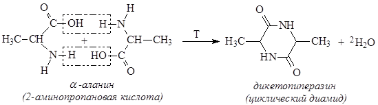 Гидрокси- и аминокислоты, как гетерофункциональные соединения, проявляют типичные свойства как карбоновых кислот, так и свойства спиртов или аминов. Однако для них характерны и специфические реакции, обусловленные взаимным расположением функциональных групп. При нагревании a-аминокислоты подвергаются межмолекулярной дегидратации с образованием устойчивых шестичленных гетероциклов – дикетопиперазинов: