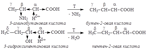 Нагревание b-амино- и b-гидроксикислот ведет к внутримолекулярному отщеплению аммиака или воды и образованию a,b-непредельных кислот: