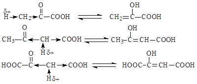 При наличии двух карбоксильных групп в молекулах оксокислот более сильные кислотные свойства проявляет та карбоксильная группа, ближе к которой расположена оксогруппа. Из-за более близкого расположения электроноакцепторного заместителя на атоме углерода такой карбоксильной группы возникает больший частичный положительный заряд и связь О-Н поляризуется в большей степени, что приводит к усилению кислотности. Присутствие в молекулах двух сильных электроноакцепторных заместителей приводит к возникновению С-Н кислотного центра, благодаря которому для оксокислот характерна кето-енольная таутомерия.