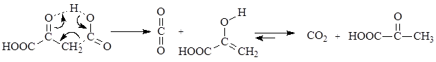 Легкость декарбоксилирования этих соединений обусловлена синхронным переносом протона от карбоксильной группы к карбонильной через образование внутримолекулярного переходного состояния.