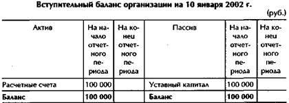 Пример 2.18. ООО «НБА», учредителями которого являются два физических лица с равными долями уставного капитала, зарегистрировано 10 января 2002 г. Учредительными документами предусмотрен уставный капитал в размере 100 000 руб. (по 50 000 руб. от каждого учредителя). Уставный капитал на момент регистрации ООО «НБА» внесен на расчетный счет полностью. На основании этой информации составляется вступительный бухгалтерский баланс: