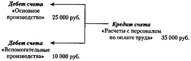 На практике применяют два типа бухгалтерских проводок: • простые; • сложные. Простые проводки — это проводки, в которых корреспондируют только два счета: один по дебету и один по кредиту. Все рассмотренные нами выше проводки были простыми. Сложные проводки — это проводки, в которых один счет корреспондирует с несколькими счетами: один по дебету, несколько по кредиту либо несколько по дебету и один по кредиту. Особенностью сложных проводок является то, что, с одной стороны, производится запись только по одному счету, а с другой — по нескольким. Пример 2.19. Начислена заработная плата рабочим основного производства в сумме 25 000 руб. и вспомогательного производства в сумме 10 000 руб. Хозяйственная операция вызывает изменение по счетам «Расчеты с персоналом по оплате труда», а также «Основное производство» и «Вспомогательные производства». Задолженность организации перед работниками при начислении заработной платы увеличивается на 35 000 руб. (25 000 руб. + 10 000 руб.). Счет бухгалтерского учета «Расчеты с персоналом по оплате труда» — пассивный, увеличение по пассивным счетам отражается по кредиту. Одновременно произошло увеличение затрат на оплату труда в основном и вспомогательном производстве на суммы соответственно 25 000 руб. и 10 000 руб. Это увеличение отражается на активных счетах «Основное производство» и «Вспомогательные производства» по дебету. Хозяйственная операция будет оформлена сложной бухгалтерской проводкой: