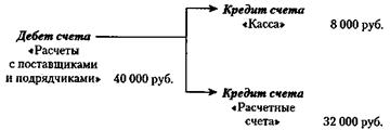 Пример 2.20. ООО «НБА» погасило задолженность поставщику в сумме 40 000 руб., заплатив 8000 руб. наличными из кассы организации и 32 000 руб. с расчетного счета. Хозяйственная операция вызывает изменения по счетам «Расчеты с поставщиками и подрядчиками», а также «Касса» и «Расчетные счета». Задолженность организации перед поставщиком уменьшилась на 40 000 руб., поскольку произошла оплата наличными и безналичными средствами. Счет «Расчеты с поставщиками и подрядчиками» — пассивный, уменьшение по пассивному счету отражается по дебету счета. Одновременно произошло уменьшение денежных средств в кассе на сумму 8000 руб. и на расчетном счете организации на сумму 32 000 руб. Счета «Касса» и «Расчетные счета» — активные, уменьшение по активным счетам отражается по кредиту счета. Хозяйственная операция будет оформлена сложной проводкой:
