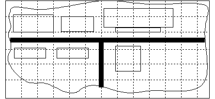 Регулярно-ячеистое представление данных Регулярно-ячеистое представление пространственных объектов путем соотнесения объектов с территориальными регулярными ячейками некоторых сетей – это модель, используемая в первых геоинформационных проектах (например, система CGIS, Канада). Этот подход включает разбиение территории на ячейки правильной геометрической формы (прямоугольной, квадратной, треугольной и т.п.) в некоторой системе координат. На рис. 3.13 изображен фрагмент городской территории, покрытый прямоугольной сеткой – в качестве ячеек выступают прямоугольные ячейки. Размер ячеек зависит от того, с какой детальностью мы хотим описать территорию. Сеть может строиться, разумеется мысленно, на плоскости или поверхности эллипсоида, в последнем случае регулярными ячейками являются сферические трапеции заданного углового размера. Размеры ячеек могут быть различными и определяются требуемым пространственным разрешением.