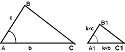 Если две стороны одного треугольника пропорциональны двум сторонам другого треугольника и углы, образованные этими сторонами, равны, то треугольники подобны.