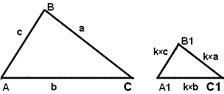 У подобных фигур соответствующие углы равны, а соответствующие отрезки пропорциональны. Подобные фигуры обладают свойством транзитивности(две фигуры подобные третей, подобны между собой) Обозначим через K (коэфициент пропорциональности) отношение стороны второго треугольника к соответствующей стороне первого треугольника.