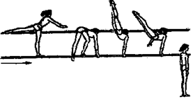 ¨ Соскок толчком бедра из седа на нж. Техника выполнения: Выполнение начинается с перехвата руки с в/ж на н/ж, затем следуют энергичное отталкивание бедром от н/ж и приземление. Опорная рука помогает удерживать равновесие, а свободная от опоры оформляет положение соскока. Страховка: оказывается стоя сзади под спину. ¨ Соскок махом вперед из упора сзади на н/ж. Техника выполнения: Для его выполнения надо предварительно прогнуться, затем энергичным махом поднять ноги вперед и, отталкиваясь руками от жерди, прогнуться и приземлиться. Страховку и помощь оказывают стоя сбоку одной рукой под живот, другой под спину. ¨ Соскок углом назад из седа на бедре на н/ж. Техника выполнения: последовательность: поднять ноги вперед из седа углом, затем, опуская их внутрь, повернуться лицом к в/ж, одновременно перехватывая правую руку у правого бедра и отпуская левую руку, сделать активный перемах двумя ногами через н/ж, прогнуться, опираясь на правую руку, и приземлиться. Последовательность обучения: Изучение начинают из седа на н/ж лицом к в/ж; после предварительного замаха ногами вправо активным перемахом через жердь и отталкиванием левой рукой выполняется соскок. Страховка: Оказывают за пояс, с тем чтобы занимающийся почувствовал опору на правую руку в момент перемаха ногами назад. ¨ Техника выполнения: Выполняется махом одной, толчком другой соскок прогнувшись (ноги соединить под углом 60-70о ) (рис.10). Последовательность обучения: Из стойки боком к гимнастической стенке хватом одной за 4-5- рейку снизу, другая с опорой о пол – махом стойка фиксируя положение перегиба с помощью поддержки партнером. Страховка: оказывают сбоку одной под плечо. ¨ Соскок из упора на в/ж лицом внутрь соскок махом назад (прогнувшись) через н/ж. Техника выполнения: Подминая правую руку вверх и наклоняясь вперед, поставить руку на н/ж. Быстро выполнить мах назад, перейдя в положение стойки (правая на н/ж, левая – хватом за н/ж). Не задерживаясь в стойке, поворачиваясь налево, продолжить движение через н/ж, перехватить левую руку на н/ж, опустить правую руку и выполнить приземление левым боком к снаряду. Последовательность обучения: Изучается с помощью подводящих упражнений у гимнастической стенки, на брусьях р/в. Помогающий стоит на брусьях или на повышенной опоре и содействует выходу в стойку и повороту. К самостоятельному исполнению можно допускать только полного освоения. Страховка: Стоя у н/ж впереди занимающегося, предотвращая сгибание рук в стойке и удар ногами о жерди. ¨ Соскок переворотом назад прогнувшись из седа на в/ж лицом внутрь. Техника выполнения: Наклоняя голову на грудь и подавая плечи назад, начать опускание туловища, удерживая бедра у в/ж слегка согнутыми руками. В положение виса прогнувшись сзади полностью разогнуть руки и, сохраняя прогнутое положение перейти в горизонтальный вис сзади и, не останавливаясь в нем, отпустить в/ж и выполнить приземление. Последовательность обучения: Изучение начинается на н/ж или низкой перекладине с помощью, обращая внимание на своевременное отпускание рук. Страховка: Помощь оказывается стоя сбоку под живот и бедро.