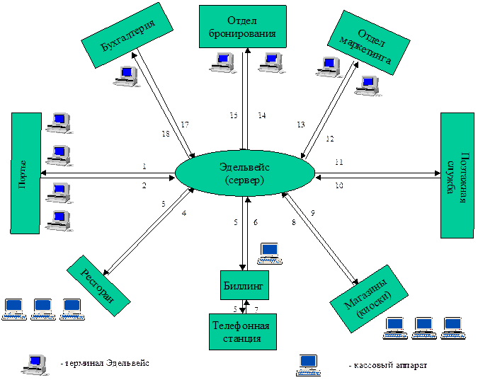 Горничные Отчеты. Статистика Бухгалтерия Группы · Быстрое создание и размещение группового резервирования · Корректное разделение оплаты: гость-фирма · Поздние приезды, досрочные выезды, отделения и присоединения к группе · Контроль дебиторской задолженности партнеров · Разнесение услуг по разным счетам одного гостя с оплатой разными платежными средствами · Наличная и безналичная оплата, кредитные карты, зачет по договору · Контроль оплаты услуг, в т.ч. и автоматический · Автоматическое занесение проводок на счета · Возможность настройки под бланки гостиницы · Генерация дополнительных отчетов · Трехмерные графики загрузки, маркетинговая информация в различных разрезах · Трехуровневый статус номера (не убран / убран / готов к заселению) · Автоматическое изменение статуса с телефонного аппарата в номере · Блокировка комнат (ремонт, указания руководства) · Лист уборок · Хранение данных о гостях / фирмах / турагенствах · Статистика неприездов ("no show") · Статистика по обороту по гостям / фирмам / агенствам · Статистика всех событий и проводок по гостю и по фирме в целом На схеме, приведенной на рис.26.3, показаны основные блоки гостиничной структуры, так или иначе связанные с системой Эдельвейс. Система построена в архитектуре клиент-сервер (хотя для небольших гостиниц допускается установка на одном компьютере). В центре показан центральный сервер системы, на котором хранится вся информация, когда-либо занесенная в систему (срок хранения ограничен только размером жесткого диска). По периметру располагаются рабочие места пользователей. На рисунке они сопоставлены конкретным отделам, а количество рабочих мест в каждом отделе показано приблизительно. Стрелками показаны основные информационные потоки, протекающие между рабочими станциями и сервером. На них стоит остановиться подробнее.