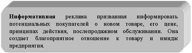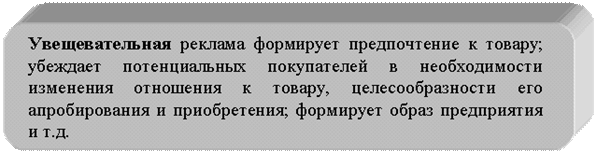 В соответствии с задачами рекламы выделяют следующие её виды: Реклама эффективна лишь тогда, когда удовлетворяет следующим требованиям: 1. четко формулирует рыночную позицию товара, т.е. содержит информацию об особенностях его использования, отличия от товаров конкурентов; 2. обещает потребителю существенные выгоды при покупке товара, показывая его достоинства, создает положительный образ; 3. содержит оригинальную и в то же время легкую для восприятия идею; 4. создает и внедряет в сознание покупателей образ товара, увеличивающий его ценность в глазах потребителей; 5. высоким уровнем исполнения подчеркивает качество товара; 6. оригинальна и не скучна, не повторяет известные решения; 7. имеет точную целевую направленность; 8. привлекает внимание художественными и текстовыми решениями, размещением рекламного объявления; 9. делает акцент на уникальные черты и свойства товара; 10. концентрирует внимание на главном, предлагает лишь то, что важно для потребителя, и обращается непосредственно к нему.