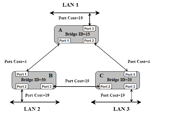 Пример работы STP Для примера рассмотрены 3 коммутатора, подключенные с образованием петли. Т.о., в сети могут возникнуть проблемы с зацикливанием пакетов. Например, пусть какой-либо компьютер в сети LAN1 посылает широковещательный пакет. В соответствии с логикой работы коммутаторов, коммутатор А передаст этот пакет во все подключенные к нему сегменты, за исключением того, из которого он пришел. Коммутатор B получит этот пакет и передаст его коммутатору С. Коммутатор С, также получит широковещательный пакет от коммутатора А и передаст его коммутатору В. Тот в свою очередь, вернет его коммутатору A и так далее. Т.е., пакеты могут ходить по сети бесконечно долго, что может привести к нарушению работоспособности сети. В этом примере с помощью STP блокируется соединение между коммутаторами С и B.