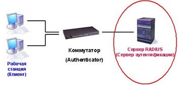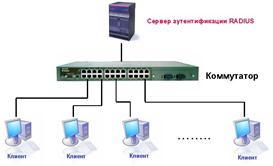 Сервер аутентификации – выполняет фактическую аутентификацию клиента. Сервер аутентификации проверяет подлинность клиента и информирует коммутатор предоставлять или нет клиенту доступ к локальной сети. RADIUS работает в модели клиент/сервер, в которой информация об аутентификации передается между сервером и клиентами RADIUS. Т.к. коммутатор работает как прокси, сервис аутентификации прозрачен для клиента.