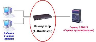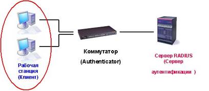 Клиент – Это рабочая станция, которая запрашивает доступ к локальной сети и сервисам коммутатора и отвечает на запросы от коммутатора. На рабочей станции должно быть установлено клиентское ПО для 802.1x,например то, которое встроено в ОС Microsoft Windows XP.