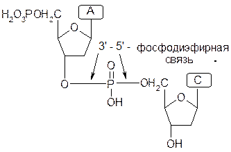 1) Первичная структура – последовательность нуклеотидных звеньев, соединенных с помощью 3’-5’-фосфадиэфирных связей. Например, соединим дезоксиадениловую и дезоксицитидиловую кислоты: