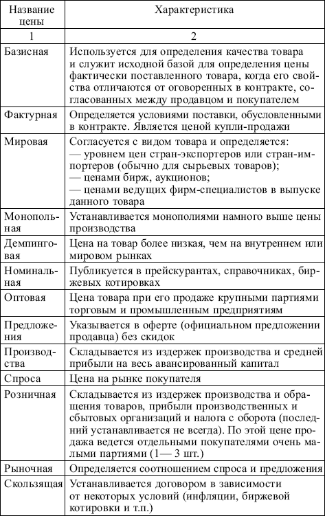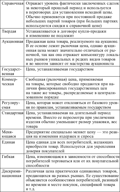 В системе маркетинга используются различные виды цен. Некоторые из них представлены в табл. 4.3.