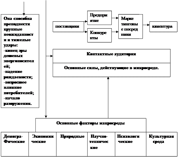 Влияние внешней среды на спрос может быть представлено с помощью моделей, более детально описывающих внешнюю среду. На рис. 1 приведено описание двух основных компонентов внешней среды: микро- и макросреды, составляющих в совокупности маркетинговую среду предприятия. Микросреда представлена совокупностью активных субъектов и сил, имеющих непосредственное отношение к предприятию, а макросреда представлена факторами более широкого социального плана. Модель имеет иерархическую структуру, что позволяет выявить и учесть всю совокупность факторов внешней среды, а также наиболее значимые факторы, влияющие на спрос. Вопрос: Опишите детально по рис. 1 состояние макро- и микросферы предприятия. Отметьте, какие элементы способствуют развитию маркетинга в России, а какие - препятствуют.