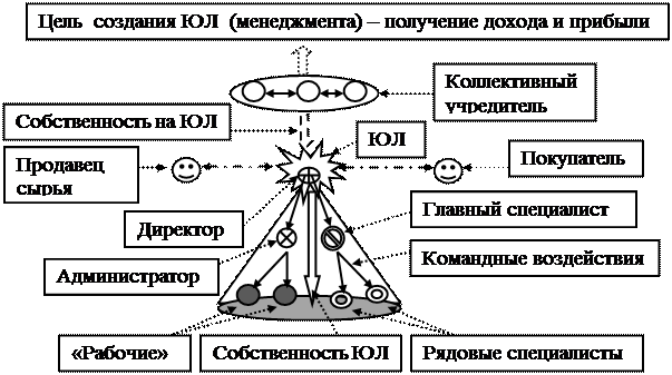 Рис.3. Модель системы, состоящей из юридического лица и его ближайшего (локального) окружения На рисунке в центре изображена модель функциональной структуры юридического лица, которое в целях получения дохода и прибыли находится в договорных отношениях с продавцом сырья, из которого изготавливается товар, и с покупателем товара, реализуемого данным ЮЛ. За термином юридическое лицо «скрываются»: 1) объединение из трех учредителей (самоуправленческая организация), которое является собственником юридического лица и его законодательным (высшим) органом власти - высший менеджер; 2) директор ЮЛ, выполняющий задания учредителя, заключающий договора с внешними рыночными субъектами для получения дохода и прибыли, а также выполняющий функции работодателя, организующего работу персонала и управляющего его работой на основе «командно-административной власти» - «главный менеджер»; 3) персонал, состоящий из наемных работников, одна часть которого находится под руководством администратора – «административного менеджера»; 4) другая часть персонала состоит из рядовых специалистов (рядовых менеджеров), которые работают под руководством главного специалиста (руководящего менеджера): 5) третья часть персонала, которая занимается производством товара называется «рабочими», не является менеджерами. В данной модели «учредитель + директор + администратор + главный специалист + все рядовые специалисты» = «мир менеджеров».