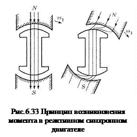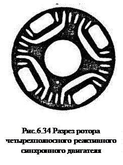 Поэтому для увеличения момента используют специальные конструкции роторов (рис. 6.34) у которых в стальном цилиндре делаются прорези, залитые алюминием. Так как алюминий не проводит магнитный поток, то в поперечном направлении магнитное сопротивлении в 4-5 раз меньше чем в продольном. Это приводит к увеличению момента. Алюминиевые прослойки замыкаются между собой и служат пусковой обмоткой. Достоинства этих двигателей — простота конструкции, отсутствие возбудителя и невысокая стоимость. Реактивные двигатели нашли широкое применение в устройствах автоматики, звуко- и видеозаписи и в других установках, требующих постоянства частоты вращения.