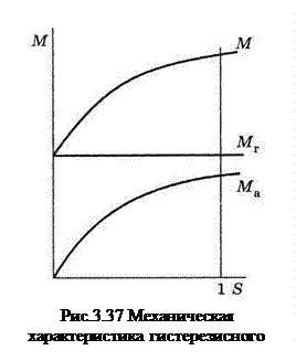 Механическая характеристика приведена на рис. 6.37. Гистерезисный двигатель может работать как в асинхронном, так и в синхронном режиме. Синхронный режим более экономичен, чем асинхронный, потому что асинхронный режим требует наличия вихревых токов, что связано с большими потерями в роторе. Достоинства гистерезисных двигателей: 1. Простота конструкции. 2. Бесшумность и надежность в работе. 3. Легкий пуск: сравнительно большой пусковой момент и малый пусковой ток ( 4. Сравнительно высокий КПД. Недостатки: 1. Низкий коэффициент мощности. 2. Высокая стоимость. Магнитотвердые материалы дорогие. 3. Качания при колебаниях нагрузки.