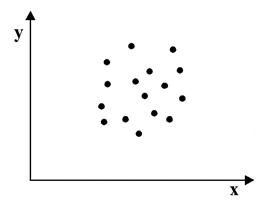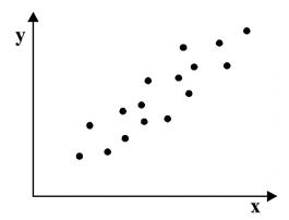 Связь, которая существует между случайными величинами разной природы, например, между величиной Х и величиной Y, не обязательно является следствием прямой зависимости одной величины от другой (так называемая функциональная связь). В некоторых случаях обе величины зависят от целой совокупности разных факторов, общих для обеих величин, в результате чего и формируется связанные друг с другом закономерности. Когда связь между случайными величинами обнаружена с помощью статистики, мы не можем утверждать, что обнаружили причину происходящего изменения параметров, скорее мы лишь увидели два взаимосвязанных следствия. Например, дети, которые чаще смотрят по телевизору американские боевики, меньше читают. Дети, которые больше читают, лучше учатся. Не так-то просто решить, где тут причины, а где следствия, но это и не является задачей статистики. Статистика может лишь, выдвинув гипотезу о наличии связи, подкрепить ее цифрами. Если связь действительно имеется, говорят, что между двумя случайными величинами есть корреляция. Если увеличение одной случайной величины связано с увеличением второй случайной величины, корреляция называется прямой. Например, количество прочитанных страниц за год и средний балл (успеваемость). Если, напротив рост одной величины связано с уменьшением другой, говорят об обратной корреляции. Например, количество боевиков и количество прочитанных страниц. Взаимная связь двух случайных величин называется корреляцией, корреляционный анализ позволяет определить наличие такой связи, оценить, насколько тесна и существенна эта связь. Все это выражается количественно. Как определить, есть ли корреляция между величинами? В большинстве случаев, это можно увидеть на обычном графике. Например, по каждому ребенку из нашей выборки можно определить величину Хi (число страниц) и Yi (средний балл годовой оценки), и записать эти данные в виде таблицы. Построить оси Х и Y, а затем нанести на график весь ряд точек таким образом, чтобы каждая из них имела определенную пару координат (Хi, Yi) из нашей таблицы. Поскольку мы в данном случае затрудняемся определить, что можно считать причиной, а что следствием, не важно, какая ось будет вертикальной, а какая горизонтальной. а)