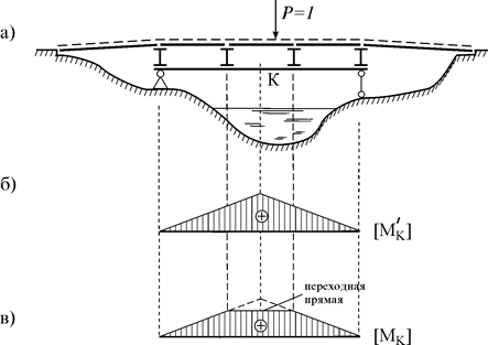 Рис. 5.4 Если бы нагрузка действовала только на главную балку, ЛВ момента MK была бы как на рис. 5.4 б. Поэтому, когда единичная сила находится над поперечными балками, ординаты ЛВ будут такими же. Но, когда единичная сила находится между поперечными балками, ЛВ сглаживается (рис. 5.4 в).