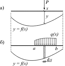 S=S Pi yi. Действие распределенной нагруз-ки (рис. 5.5 б). Если рассматривать элементарную силу q(x)dx как сосредоточенную силу, то Рис. 5.5 S= Когда же распределенная нагрузка постоянна, т.е. q(x)=q=const, то S=q Здесь w – площадь ЛВ в области действия распределенной нагрузки. Если на сооружение действует несколько сосредоточенных сил и распределенных нагрузок, то по принципу суперпозиции S=S Pi yi+S qj ωj.