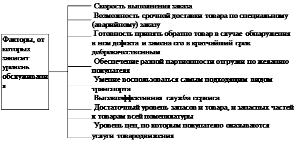 Формы маркетинга прямых продаж: - продажа товаров по каталогу; - почтовая рассылка («директ-мейл»); - продажа по телефону (телемаркетинг); - телевизионный маркетинг; - формирование банка данных о покупателях. Система, обеспечивающая доставку товара к моменту продажи (для товаров производственного назначения - к месту потребления) в точно определенное время и с максимально высоким уровнем обслуживания покупателя, называется в маркетинге ТОВАРОДВИЖЕНИЕМ. Для хорошо работающей системы товародвижения очевидно, что срок поставки товара после получения заказа является константой независимо от дальности транспортировки. Вероятность выполнения заказа в этот срок 91-96%. Вот почему комплексный подход, учитывающий все факторы, влияющие на уровень обслуживания, является абсолютно необходимым: