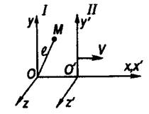 Такова связь между координатами (включая время) одного и того же события в двух инерциальных системах отсчета I и II (штрихованная система 1 движется относительной не штрихованной I со скоростью V в направлении оси х). Формулы (1.6) известны в науке как преобразования Лоренца. Вся физическая теория (механика, электродинамика и др.) подлежала после их открытия перестройке - такой, чтобы связи (1.6) были учтены. Это было осуществлено в специальной теории относительности (сначала в электродинамике Эйнштейном; позже - в механике). Из формул (1.6) в частности следует: одновременные, но происходящие в разных точках пространства, события в системе I не являются таковыми в системе II. Действительно, если