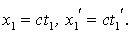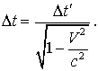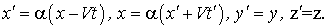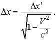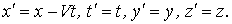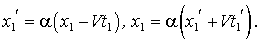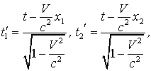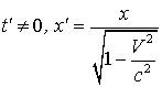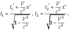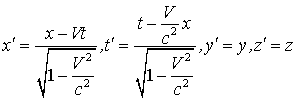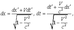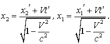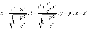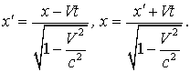 Эти формулы отличаются от (1.6) только тем, что штрихованные и не штрихованные координаты поменялись местами, а скорость (+V) заменена на (- V), что вполне понятно - системы I и II равноправны и I движется относительно II со скоростью (- V). Если