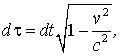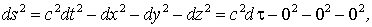 Это равенство и доказывает инвариантность интервала. Итак, в СТО при повороте декартовых осей (и параллельном их сдвиге) инвариантами являются квадрат расстояния dx2+dy2+dz2 и время dt по отдельности. Но при переходе от системы I к движущейся системе II инвариантом является квадрат интервала ds2 =c2dt2 -dx2 -dy2 -dz2, тогда как значения расстояния и промежуток времени по отдельности не сохраняются. Инвариантность интервала между двумя событиями - это математическое выражение постоянства скорости света в любой системе отсчета. Если Из инвариантности интервала следует инвариантность еще одной важной физической величины - собственного времени движущегося тела. Это понятие дает возможность построения всей цепочки мер движения в СТО, а значит и построения всей теории вообще. Собственным временем частицы называется время, которое измеряется по часам, связанным с движущейся частицей. Для пояснения приведем простой пример: время, измеренное по часам движущейся произвольно ракеты, - это и есть собственное время ракеты (команды, находящейся в ракете). Пусть мгновенная скорость частицы в некоторой ИСО I есть Инвариантное значение квадрата интервала представляется в виде