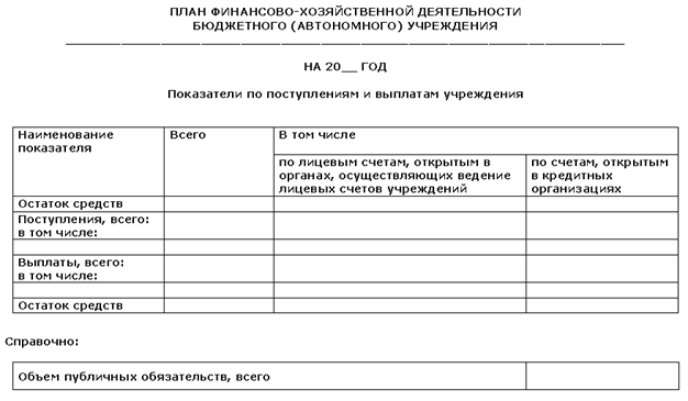 Казенные учреждения и бюджетные учреждения, на время переходного периода финансируемые по старой схеме, ведут свои плановые документы – бюджетные сметы. Бюджетные и автономные учреждения исключены из состава участников бюджетного процесса, соответственно, плановые документы у них будут свои. На основании информации о планируемых объемах расходных обязательств, предоставленной главным распорядителем, осуществляющим функции и полномочия учредителя, бюджетное (автономное) учреждение составляет план финансово-хозяйственной деятельности (далее – План). План согласуется с ГРБС-учредителем. Требования к плану ФХД утверждены приказом Минфина от 28 июля 2010г. № 81н «О требованиях к плану финансово-хозяйственной деятельности государственного (муниципального) учреждения». План ФХД включает в себя текстовую и табличную части. В текстовой части указываются · цели и виды деятельности учреждения (подразделения) в соответствии с НПА и уставом учреждения; · перечень услуг (работ), предоставление которых для физических и юридических лиц осуществляется за плату; · общая балансовая стоимость недвижимого и движимого государственного (муниципального) имущества; · иная информация по решению органа, осуществляющего функции и полномочия учредителя. В табличной части Плана указываются показатели финансового состояния учреждения (данные о нефинансовых и финансовых активах, обязательствах на последнюю отчетную дату, предшествующую дате составления Плана) и плановые показатели по поступлениям и выплатам учреждения. Плановые показатели по поступлениям формируются учреждением в разрезе: · субсидий на выполнение государственного (муниципального) задания; · целевых субсидий; · бюджетных инвестиций; · поступлений от оказания учреждением платных услуг, а также поступлений от иной приносящей доход деятельности; · поступлений от реализации ценных бумаг. Также в плане указываются расходы за счет этих поступлений. Справочно указываются суммы публичных обязательств перед физическим лицом, подлежащих исполнению в денежной форме, полномочия по исполнению которых от имени органа государственной власти (государственного органа), органа местного самоуправления передаются в установленном порядке учреждению.
