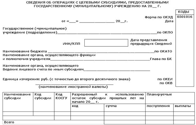 Поступления целевых субсидий (а к ним мы относим бюджетные инвестиции и субсидии на иные цели) и расходы за счет них дополнительно отражаются в отдельном плановом документе – Сведениях об операциях с целевыми субсидиями, предоставленными государственному (муниципальному) учреждению (код формы документа по Общероссийскому классификатору управленческой документации 0501016). В Сведениях поступления и расходы целевых субсидий отражаются в разрезе аналитических кодов субсидий и кодов КОСГУ. При составлении Сведений учреждением (подразделением) в них указываются: в графе 1 - наименование целевой субсидии с указанием цели, на осуществление которой предоставляется целевая субсидия; в графе 2 - аналитический код, присвоенный органом, осуществляющим функции и полномочия учредителя, для учета операций с целевой субсидией (далее - код субсидии); в графе 3 - код классификации операций сектора государственного управления, исходя из экономического содержания планируемых поступлений и выплат; в графах 4, 5 - неиспользованные на начало текущего финансового года остатки целевых субсидий, на суммы которых подтверждена в установленном порядке потребность в направлении их на те же цели в разрезе кодов субсидий по каждой субсидии, с отражением в графе 4 кода субсидии, в случае, если коды субсидии, присвоенные для учета операций с целевой субсидией в прошлые годы и в новом финансовом году, различаются, в графе 5 - суммы разрешенного к использованию остатка; в графе 6 - сумма планируемых на текущий финансовый год поступлений целевых субсидий; в графе 7 - сумма планируемых на текущий финансовый год выплат, источником финансового обеспечения которых являются целевые субсидии. Плановые показатели по выплатам могут быть детализированы до уровня групп и статей классификации операций сектора государственного управления бюджетной классификации Российской Федерации, а по группе "Поступление нефинансовых активов" - с указанием кода группы классификации операций сектора государственного управления.